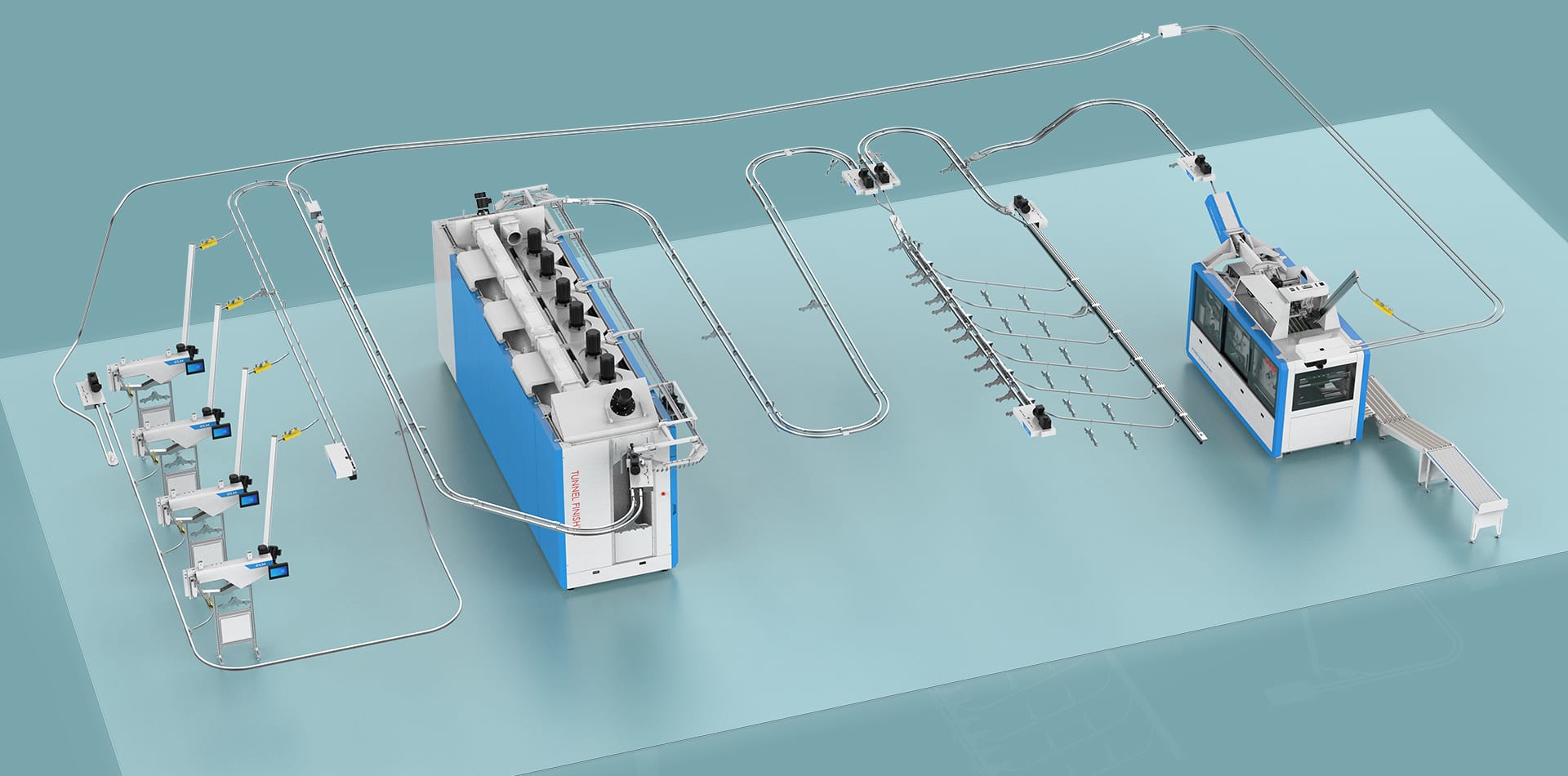 工服上料機、隧道式自動化整燙機、工服折疊機組成